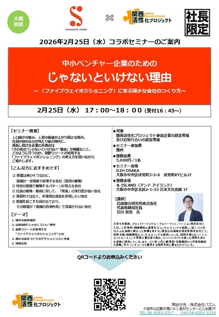 【関西活性化プロジェクト】2月のセミナーは 白潟総合研究所株式会社さまと 中小ベンチャー企 … 続きを読む 「じゃないといけない理由」