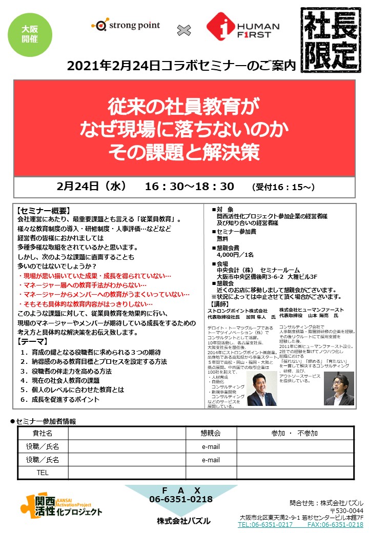 ストロングポイント株式会社様と 株式会社ヒューマンファースト様との共催で、 「従来の社員教 … 続きを読む 「従来の社員教育がなぜ現場に落ちないのか-その課題と解決策」セミナー