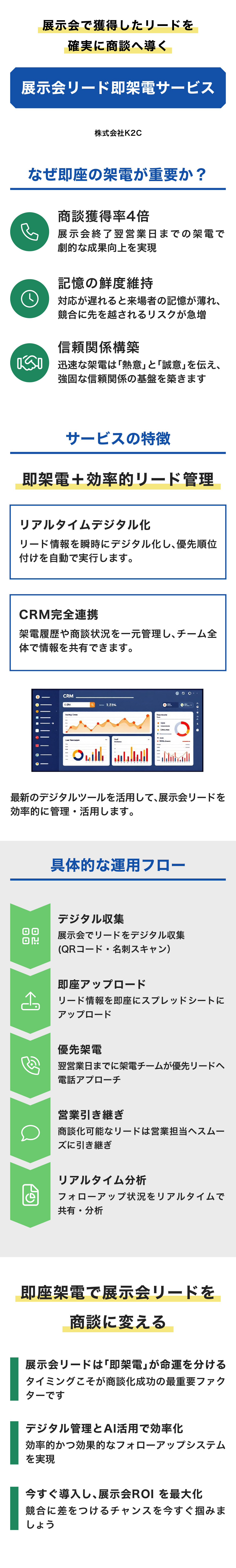 「K2C」の「展示会リード即座架電サービス」は、展示会などのイベントで獲得したリード情報に対して、迅速かつ自動的に架電を行うサービスです。